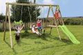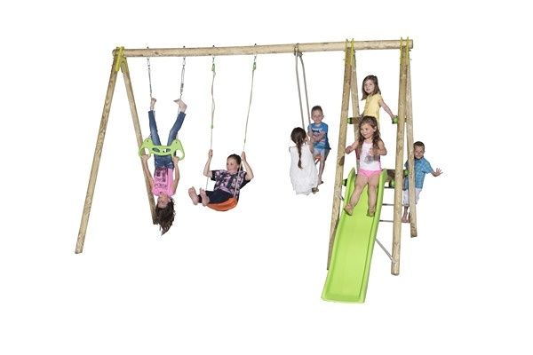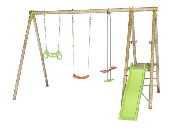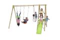 „ZANI – celoDŘEVĚNÉ sestavy 230 cm vysoké, materiál harmonizuje se okolní zahradou.Nastavitelná výška plastového sedátka, vyrobené vstřikovací metodou Houpací kluzák s plastovými sedáky a trnoží-držák na nohy,klouzačka s nástupní plošinou, hrazdička-kruhy na houpání i posilování ! Houpačka zavěšena na pevném závěsném oku. Spoje jsou kovové !“