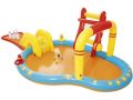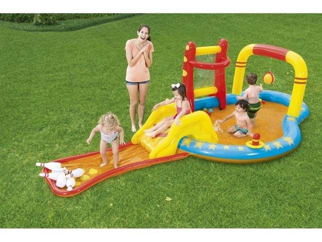 Krásné barevné nafukovací hrací centrum. Bazének se skluzavkou a kuželkami bude ozdobou, každé zahrady a nejmenší milovníci vodních radovánek budou nadšeni! Celý produkt je lehce připojitelný k zahradní hadici. Bazének nabízí mnoho možností zábavy jako střelbu míčů do košíku, hru s kuželkami a odnímatelnou skluzavku. Spodní část tvoří nafukovací polštář, který poskytuje větší pohodlí. Po ukončení vodních radovánek snadno vypustíte vodu z bazénku pomocí vypouštěcího ventilu. Bazének má kapacitu 314 litrů. Balení obsahuje opravnou sadu. Hrací sportovní centrum o rozměru 4,35 x 2,13 x 1,17 mHračka je určena pro děti 2+. Materiál hračky je vinyl. Obsah: Jeden bazén, jedna skluzavka, šest bowlingových kuželek, jeden basketbalový koš, dva nafukovací kroužky, 4 míčky na hraní, záplata pro opravu