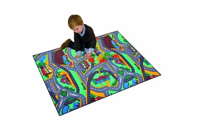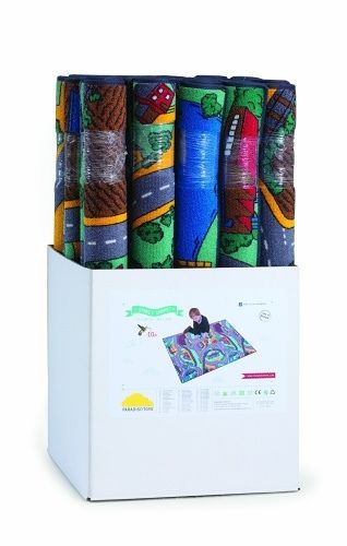 Hrací koberec silnice, domy, příroda malý. Barevný koberec je ze spodní strany opatřen antiskluzovou vrstvou. Rozměr koberce je 67×100 cm. Vyrobeno v EU.