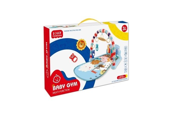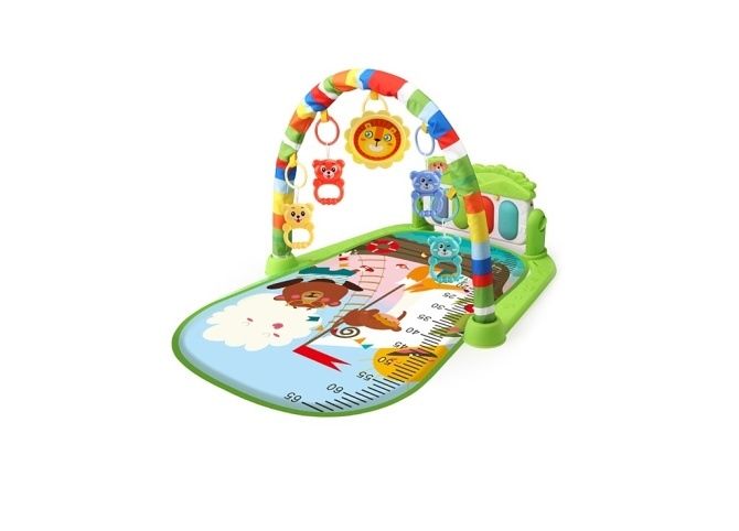 Hrací podložka má veselé barvy a různé materiály. Měkký materiál dodává příjemný pocit. Na hrazdičce jsou zavěšena veselá barevná zvířátka. Pro děti od 3 měsíců. Součástí podložky je interaktivní pianko. Na baterie: 3x AA (nejsou součástí balení)