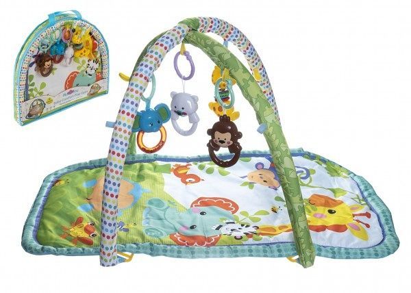 Na hrazdě jsou zavěšené odnímatelné a vzájemně propojitelné hračky. Hrazda napomáhá rozvoji smyslů a motorických schopností dítěte. Hrazdu velmi snadno složíte a použijete nejenom doma, ale i při cestování s miminkem. Podložka je snadno pratelná, vyrobena z kvalitního materiálu.