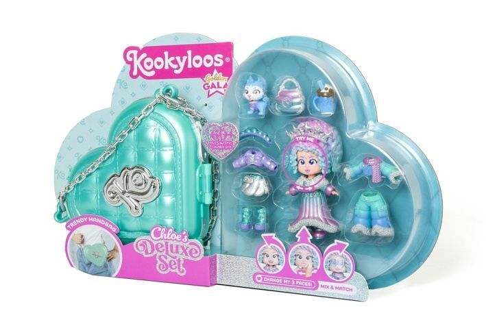 Chloe miluje stylové a okouzlující outfity a vždy ví, jak zazářit – ať už venčí svého pejska v parku na sluníčku, jde nakupovat s kamarádkami nebo se chystá na slavnostní Golden Gala!V setu Chloe‚s Golden Gala Deluxe najdeš 3 různé outfity pro každou příležitost. Můžeš je mezi sebou libovolně kombinovat a doladit doplňky, aby vznikly jedinečné a speciální looky. Díky třem jedinečným výrazům Kookyloos, které lze změnit jediným kliknutím, můžeš navíc sladit styl i s různým make-upem.Součástí je také elegantní kabelka ve tvaru srdce, ideální na cestu na Golden Gala – a hlavně dost prostorná, aby sis v ní mohla vzít všechny panenky i doplňky!1 exkluzivní panenka,3 outfity,2 páry bot,2 tiáry,1 svačinka,1 domácí mazlíček,1 kabelka pro děti ve tvaru srdce.