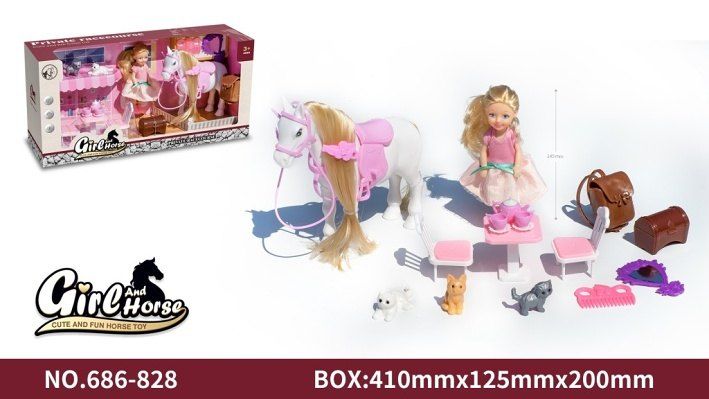 Hrací set obsahuje panenku, koníka, kočky, stoleček, židle, truhlu a další doplňky.