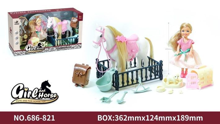 Hrací set obsahuje panenku, koníka, pejska s pelíškem, cestovní box na převoz pejska a další doplňky.