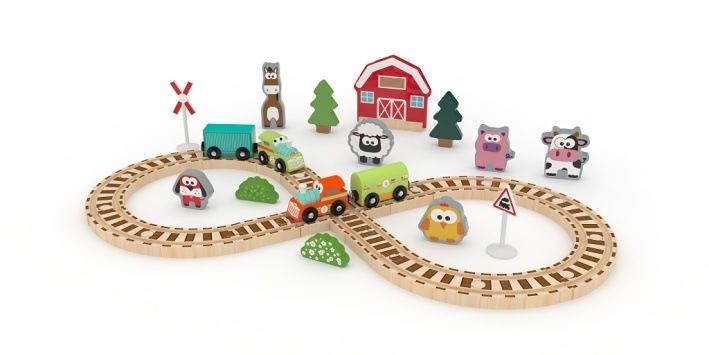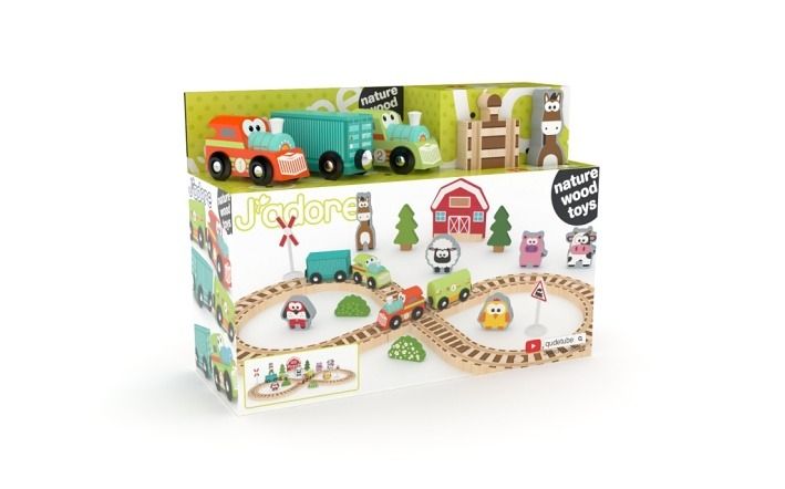 J`adore je řada vzdělávacích hraček pro nejmenší, vyrobených z ekologicky udržitelného dřeva, bez chemikálií. Produkt stimuluje dětskou fantazii. Set je vhodný pro děti od 3 let. Set obsahuje koleje, vláček, figurky zvířátka, domeček a stromy.