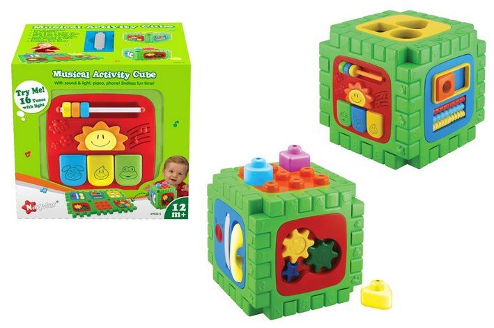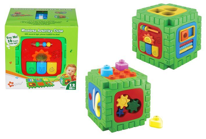 Zelená plastová hrací kostka, doplněná mnoha barevnými aktivitami, určitě přiměje ke hře nejmenší děti. Po stisknutí tlačítek žabičky, kočičky, kačenky, vydává zvuky. Pianko je také opatřeno zvukem a světlem. Barevná ozubená kolečka nabádají k jejich roztočení. Děti si tak rozvíjí vnímání a motoriku.