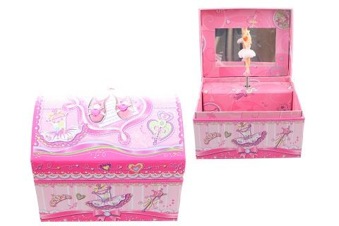 Hrací skříňka šperkovnice truhla. Uvnitř špekovnice je zrcátko a baletka, která po natažení klíčku tančí a hraje. Velikost cca 13 x 10 x 10 cm. Baleno v igelitovém sáčku. Výrobek není hračka.