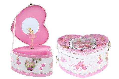 Hrací skříňka šperkovnice srdíčko. Uvnitř špekovnice je zrcátko a baletka, která po natažení klíčku tančí a hraje. Velikost cca 16,5 x 15 x 8 cm. Baleno v igelitovém sáčku. Věk 3+