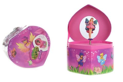 Hrací skříňka šperkovnice s vílou. Uvnitř špekovnice je zrcátko a víla, která po natažení klíčku tančí a hraje. Velikost cca 12 x 11,5 x 8,5 cm. Baleno v igelitovém sáčku. Věk 3+