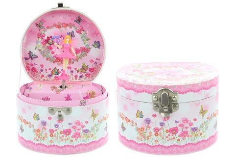 Hrací skříňka šperkovnice s vílou. Uvnitř špekovnice je víla, která po natažení klíčku tančí a hraje. Velikost cca 12,5 x 8 x 11 cm. Baleno v igelitovém sáčku. Věk 3+