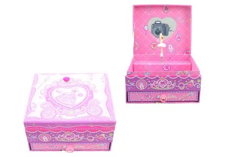 Hrací skříňka šperkovnice truhla. Uvnitř špekovnice je zrcátko a baletka, která po natažení klíčku tančí a hraje. Velikost cca 16 x 14 x 9 cm. Baleno v igelitovém sáčku. Šperkovnice má dole šuplíček. Výrobek není hračka.