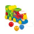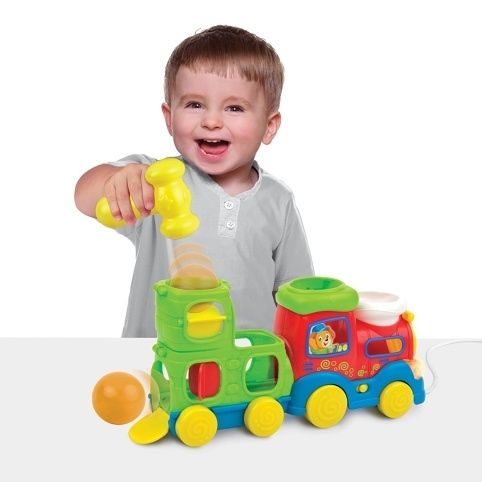 Barevný, zábavný vláček zaměstná i ty nejmenší děti. V balení naleznete vláček, 3 barevné míčky, kladívko. Pomocí kladívka zatloukejte míčky do otvorů vláčku a sledujte jak rychle vypadnou ven. Vláček má dvě čelní světla, za provázek ho můžete vozit, vydává zábavné zvuky a hvízdá. Hračka vyžaduje 2× AAA baterie, jsou součástí. Na baterie: 2x AAA (jsou součástí balení)