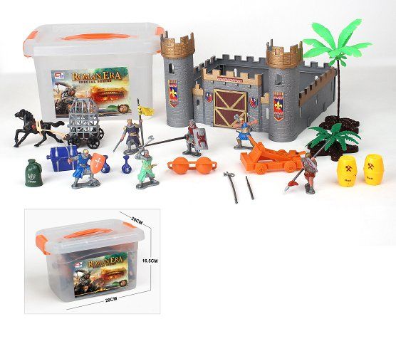 Hrad s figurkami. Součástí je hrad, 6 figurek postaviček, koně, zbraně a další příslušenství.