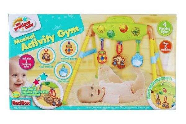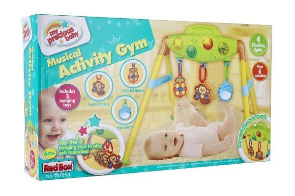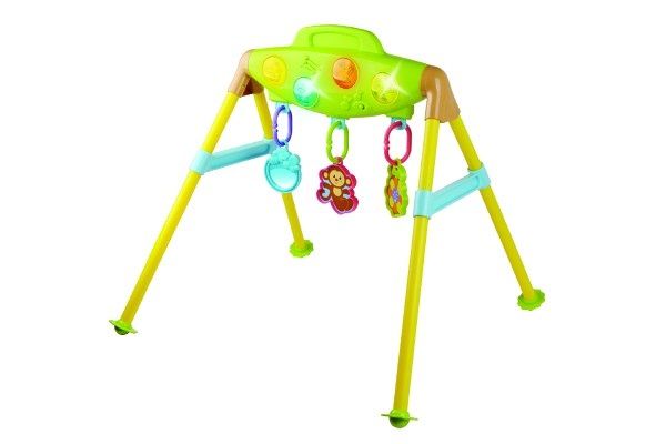 Barevná plastová hrazdička se třemi závěsnými hračkami. Hrazda hraje a svítí, barevné závěsné hračky rozvíjejí dětský zrak a hmat. Hrazda je skvělá vývojová hračka pro děti. Na hrazdě je zavěšené zrcátko, opička a kytička. Prvky lze odepnout.