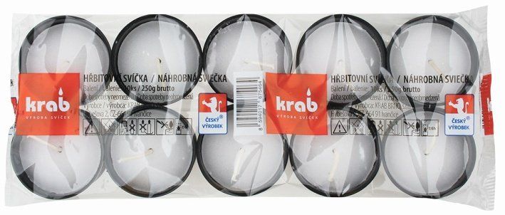 Doba hoření 1 svíčky, cca 6 hodin Baleno po 10 svíčkách v sáčku. Rozměr svíčky: 5 x 3 cm (š x v) Svíčky mají vyšší dno. Vyrobeno v ČR Výrobce:KRAB BRNO, s.r.o.