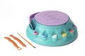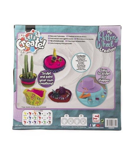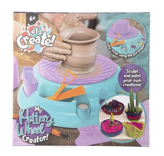 Hrnčířský kruh pro nejmenší. Velmi snadné tvarování nádob. Obsahuje – hrnčířský kruh, 2 nástroje na styling, nástroj pro vyhlazování hran, šablonu na nádobu, držák nástrojů, hlínu schnoucí na vzduchu, 6 různých barev, štětec, příručku.