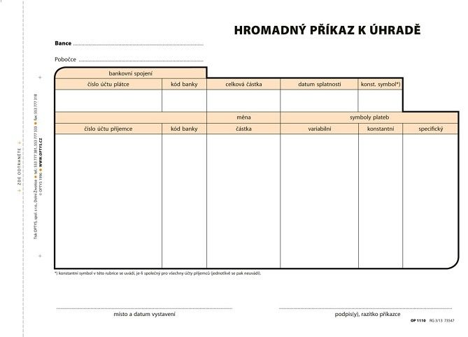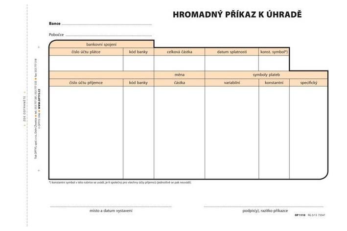 Příkaz k úhradě hromadný, A5, 100 listů, samopropisovací, OPTYS 1110