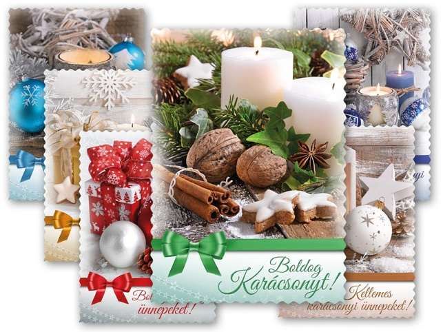 POHLEDNICE S MAĎARSKÝM TEXTEM. Pohlednice s vánoční tématikou. Text obsahuje 6 pohlednic z 6. Uvedená cena je za 1 ks Rozmery: 10,5 x 14,8 cm Papier: pohľadnicový kartón 240 g Povrchová úprava: lamino lesklé s výsekem Text : 6/6