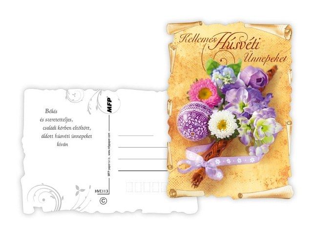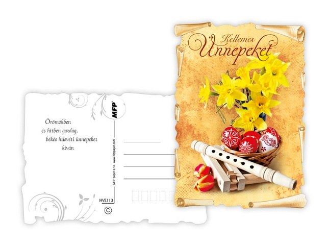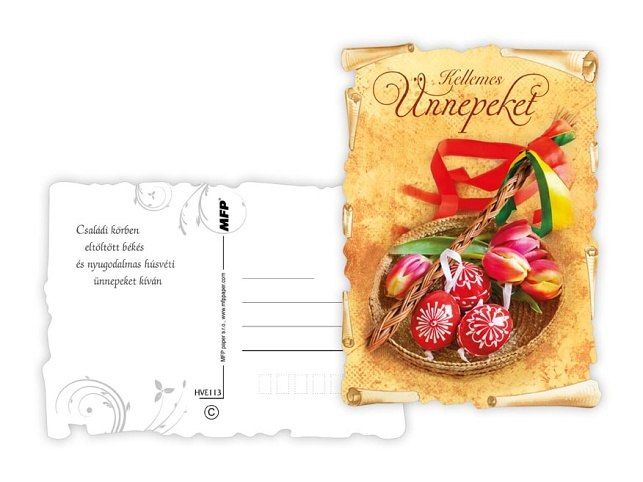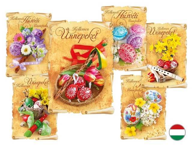 POHLEDNICE S MAĎARSKÝM TEXTEM. Pohľadnice s veľkonočným motívom. Text obsahují 3 pohlednice 6. Dodávame v mixe podľa skladových zásob. Uvedená cena je za 1 ks Rozmery: A6 10,5 x 14,8 cm Papier: pohľadnicový kartón 240 g Povrchová úprava: bez laku s výsekem Text: 6/6