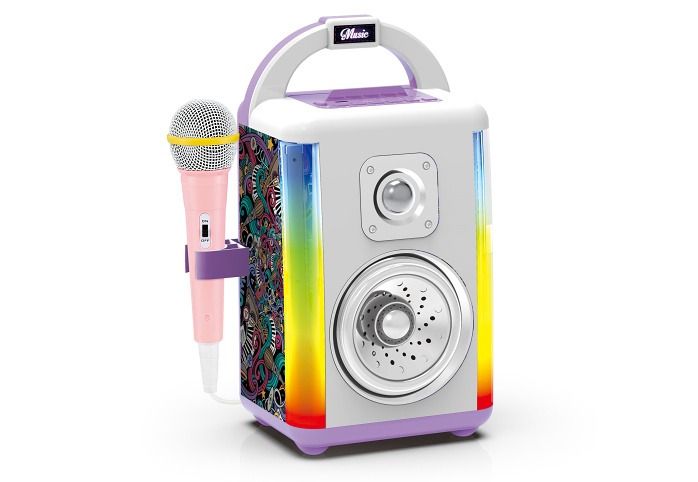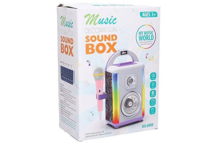 Hudební box 28cm. Rozměry 15x12x28cm. baterie 4xAA není součástí, poslech až 10 písniček, nahrávání, změna hlasu, až 5 módů osvětlení, tlačítko potlesku, 4 úrovně hlasitosti, bluetooth, nabíjecí port, sluchátkový port, připojení 2 mikrofonů, po pěti minutách nečinnosti režim spánku, přenosný, AUX připojení, 1 mikrofon v balení. Popis funkcí na obale i v balení.