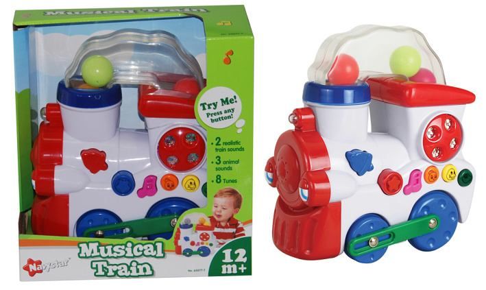 balonky. Mašinka vydává zvuky jako skutečný vlak, umí zahrát osm melodií