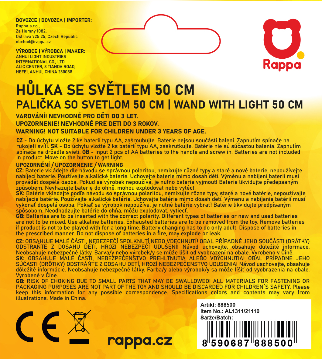 Hůlka vyžaduje 2 tužkové baterie typu AA, které nejsou součástí balení. Po přepnutí spínače začne svítit. Ideální doplněk pro lampionový průvod!
