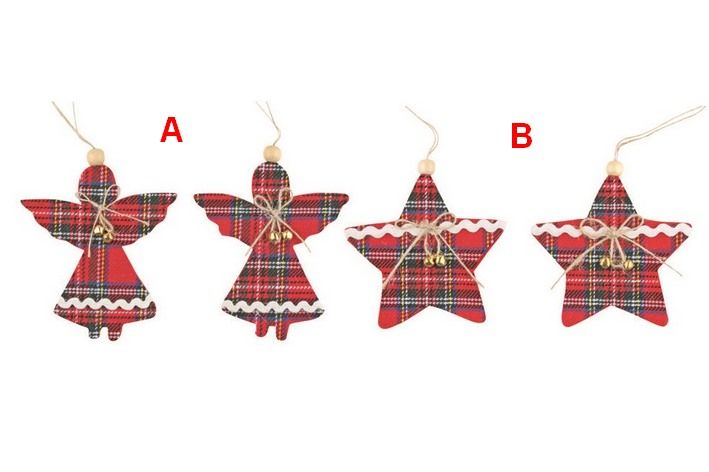 Hvězda,anděl s rolničkou káro 10cm,2ks v sáčku 2 druhy