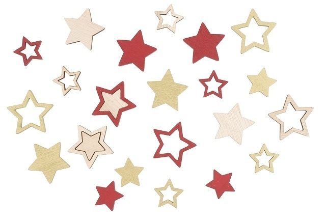 Hvězda dřevěná červená, zlatá a přírodní 2,5 cm 12 ks + 3,5 cm 12 ks