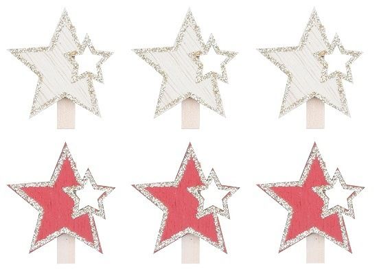 Hvězda dřevěná na kolíčku 4 cm červená a přírodní, 6 ks