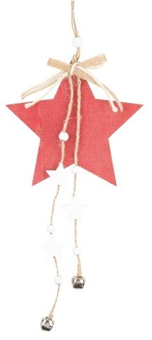 Dekorace na zavěšeníLátková mašleRolničkyDřevěné detailyVánoční dekorace na zavěšení ve tvaru hvězdy v červené barvě. Hvězdu ze dřeva zdobí látková mašlička, dřevěný korálek na šňůrce a dva provázky s dřevěnými hvězdami a korálky, zakončené rolničkou.