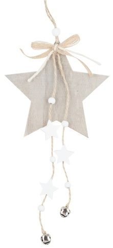 Dekorace na zavěšeníLátková mašleRolničkyDřevěné detailyVánoční dekorace na zavěšení ve tvaru hvězdy v šedé barvě. Hvězdu ze dřeva zdobí látková mašlička, dřevěný korálek na šňůrce a dva provázky s dřevěnými hvězdami a korálky, zakončené rolničkou.
