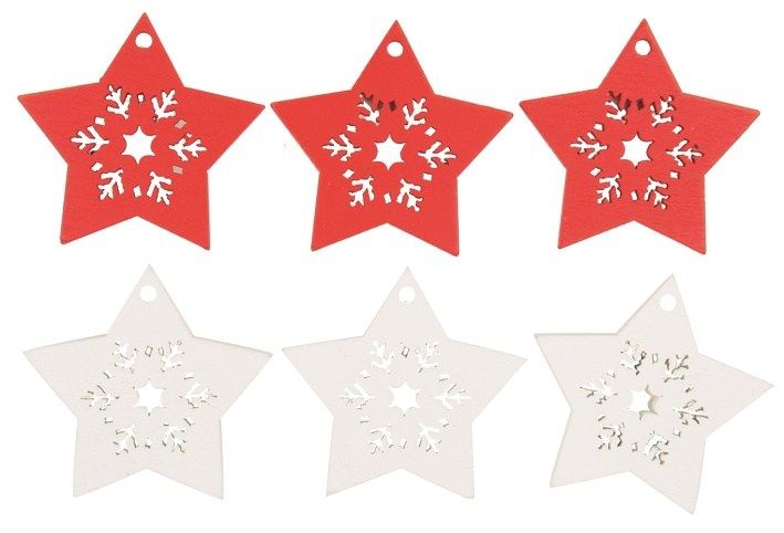 Hvězda dřevěná s lepíkem 4,5 cm, červená a bílá, 6 ks