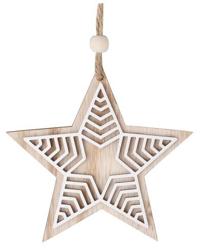 Hvězda s bílým dekorem dřevěná na zavěšení 10 cm