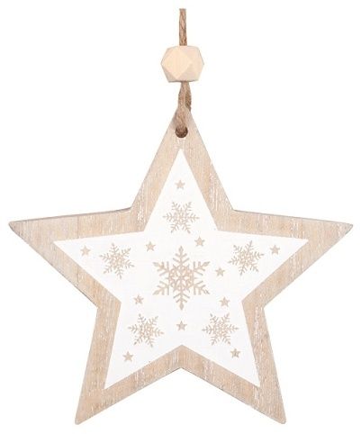 Hvězda s bílým potiskem dřevěná na zavěšení 12 x 12 x 1 cm