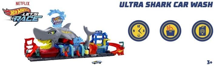 V seriálu Hot Wheels: Závod! na streamovací platformě Netflix ovládl městskou myčku Hot Wheels® obrovský žralok, který se chce vrhnout do akce plné změn barev! Děti přejedou s přibaleným angličákem Color Reveal přes rampu a vjedou do žraločí tlamy, pak st