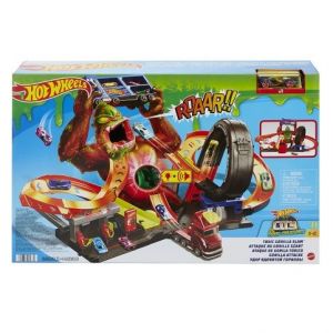Pozor! Hrozí, že na benzínku a pneuservis v Hot Wheels™ City zaútočí gorila! Jenom děti, které mají super úžasné schopnosti, ji mohou zastavit! Obří herní set s tímto nepřítelem obsahuje nastavitelní startovací zařízení, které umožňuje tři kaskadérské kousky, jak tu bestii porazit. Naštvaná gorila přitom vydává různé zvuky a bliká několika barvami. Set nabízí mnoho možností k volné hře, jeho součástí je jeden angličák Hot Wheels® v měřítku 1:64. Hot Wheels® City útok gorily™ je také možné různými způsoby připojit k dalším setům Hot Wheels® pro ještě více zábavy. Barvy a vzhled výrobku se mohou lišit.