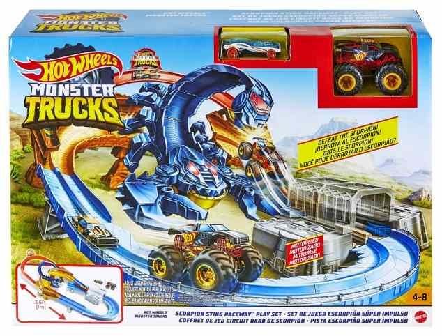Hot Wheels® Monster Trucks Bodnutí škorpiona přináší nadstandardní vylepšený set pro auta Hot Wheels® a Hot Wheels® Monster Trucks s ohromujícím novým nepřítelem - obřím škorpionem! Spojte své monster trucky s angličáky Hot Wheels® v měřítku 1:64, abyste porazili smrtícího škorpiona. Na téhle vzrušující velké trati si užiješ úžasné převýšení a zrychlovač pro hru s více auty. Nebude snadné vyhnout se tomu, aby štír do auta zaťal své drápy nebo bodl obrovské žihadlo. Ale týmovou prací dokážeš překonat výzvy, se kterými se dosud nikdo nesetkal! Set obsahuje jeden exkluzivní Monster Truck s obřími koly a jeden angličák Hot Wheels® v měřítku 1:64.