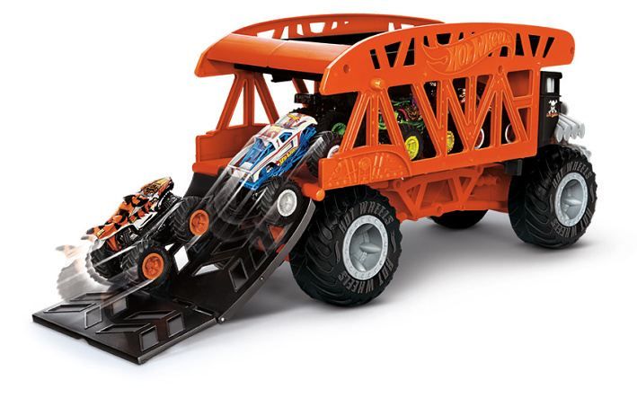 Přeprava tvých monster trucků nikdy nebyla jednoduší! Tento parádní velký tahač uveze až 12 monster trucků v měřítku 1:64. A samozřejmě nechybí typická obrovská kola, která si poradí s jakoukoliv překážkou. Jakmile dorazíš na místo, použij rampu v zadní části tahače a vyjeď se svými vozidly ven. Spouštěcí páčka navíc umožňuje vypustit do akce až šest monster trucků najednou! Když je čas přejet na další závod nebo se s hraním rozloučit, nalož své monster trucky zpět do tahače, kde počkají, dokud nebude čas znovu vyrazit do akce.