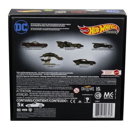 Pro největší filmové fanoušky přichází prémiová kolekce Hot Wheels® Batman™, která obsahuje pět fanoušky oblíbených angličáků Batmobil. Tato prémiová sada autíček je dodávána ve speciálním sběratelském obalu! Každé autíčko je v měřítku 1:64 a obsahuje autentické detaily z filmů, komiksů a televizních seriálů. Barvy a vzhled výrobku se mohou lišit.