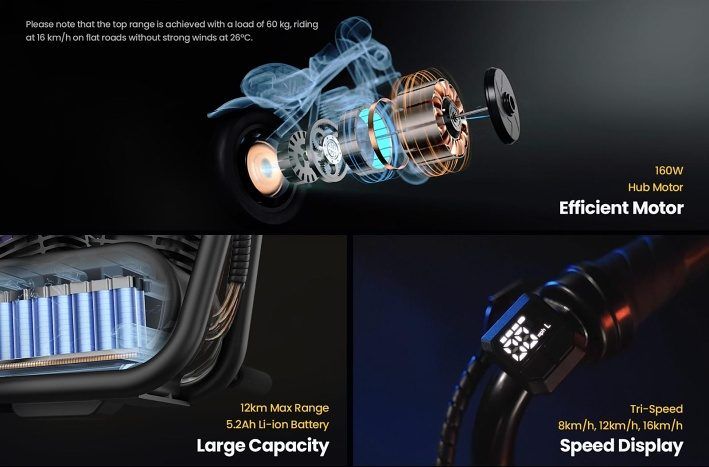 • 3 nastavitelné rychlostní stupně (8, 12, 16 km/hod)