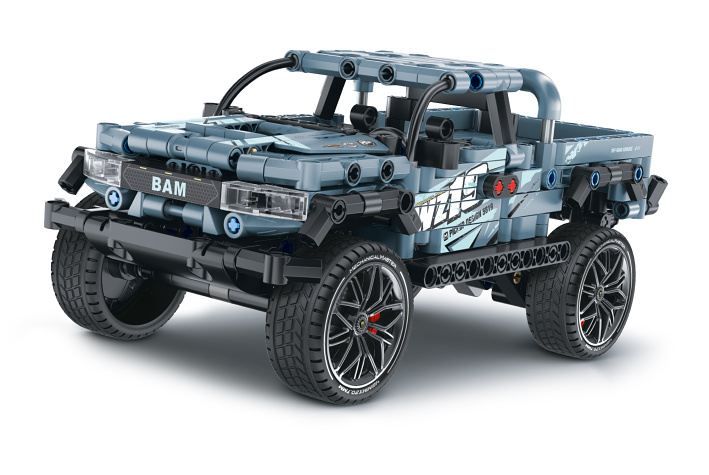 iM. Master Stavebnice auto s korbou. Rozměry 23,2x11x10,2 cm. 463 dílků. Na zpětné natažení. Otevírací dveře, fungující zadní tlumiče.
