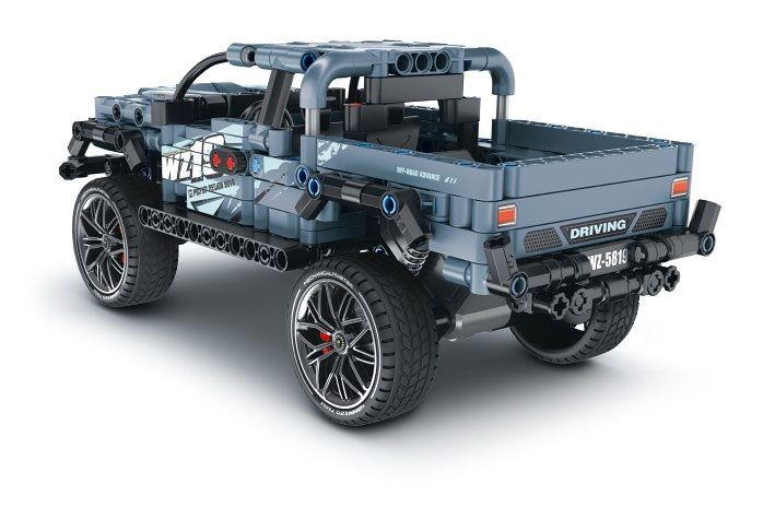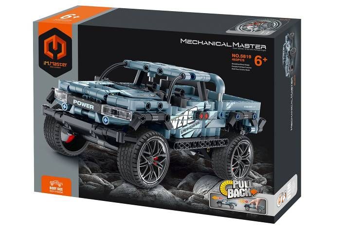 iM. Master Stavebnice auto s korbou. Rozměry 23,2x11x10,2 cm. 463 dílků. Na zpětné natažení. Otevírací dveře, fungující zadní tlumiče.