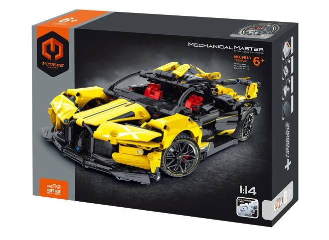 iM. Master Stavebnice auto sportovní žluté. Rozměry 33,6x15,7x10,2 cm. 1103 dílků. Otevírací dveře. Bez efektů, baterií a ovladače.