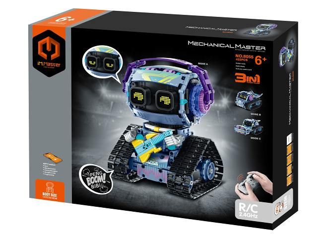 iM. Master Stavebnice robot s kytarou 3v1 RC na dálkové ovládání. Rozměry 14x15,7x21,6 cm. 433 dílků. Ovládání ovladačem nebo smartphonem. Frekvence 2. 4GHz. Bluetooth propojení s mobilem. Aplikace pro iOS a Android. Světelné a zvukové efekty. Bateriový pack 300mah 7. 4V lithium do robota součástí, 2xAA do ovladače nejsou součástí. USB kabel součástí. Přepínač ON/OFF na ovladači a bateriovém boxu robota.