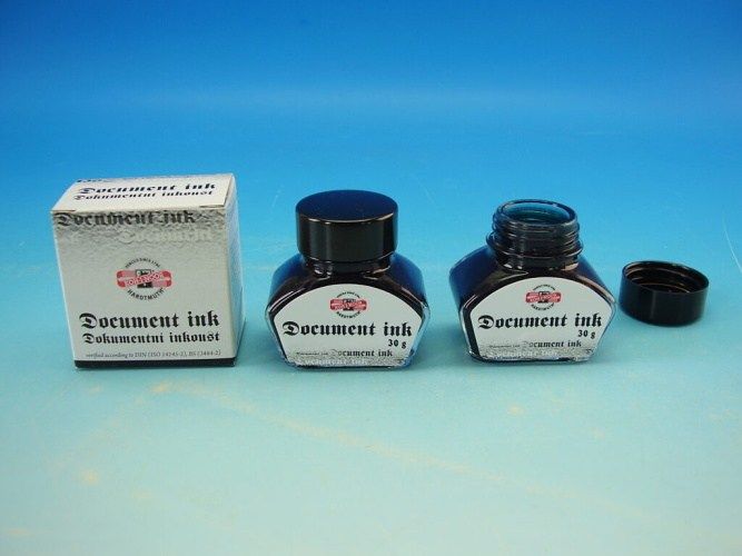Inkoust plnící dokumentní 30g černý ve skleněné lahvičce. Inkoust je vhodný do plnicích per, je světlostálý a odolný vlhkosti, nelze odstranit z papíru bez poškození papíru. Používá se v archivech , na psaní dokumentů a na matrikách Balení 50 g v PET lahvičce 30 ml ve skleněné lahvičce , v bombičkách á 7 g