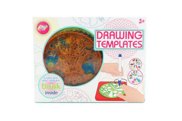 Sada obkreslovacích šablon. Obsahuje 6 obkreslovacích koleček s více než 130 tvary, 1 držák na kolečka, 1 propisku, 6 fixů, 1 blok na obkreslování. Rozměry balení cca 28 x 22 x 4 cm.