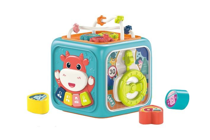 Interaktivní kostka. Rozměry 13x12,5x15,5 cm. 3xAA baterie nejsou součástí. 4 vkládací kostky. Součástí vkládačka, piano, hodiny, ozubená kolečka, volant, dvířka. Piano - 4 módy. 1. mód - piano, 2. mód - 4 písničky, 3. mód - světelná hra, 4. mód - zvuky zvířat, 5. mód - 20 melodií.
