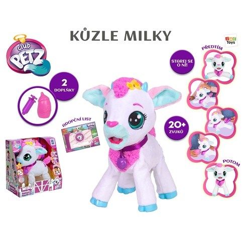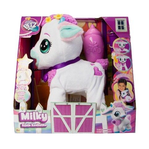 Interaktivní kůzlátko Milky, Milky vydává až 20 různých zvuků. Hezky se o ní postarej, hlaď ji po hlavě, naočkuj ji, nakrm ji. Ona se postvaví na všechny čtyři. Balení obsahuje: 1 plyšáka, 1 lahvičku, 1 injekci, 1 letáček, 1 návod. Výrobek vyžaduje 3 AG13 baterie, které jsou součástí výrobku. Výrobek je vhodný pro děti od 2 let. Na baterie: 3x LR44 (jsou součástí balení)
