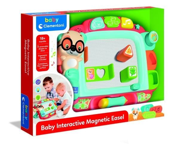 Interativní stolek Clementoni pro výuku kreslení a psaní s odnímatelnými šablonami, tužkou, magnetickými razítkamii, pravítky a gumou. Stolek podporuje psychomotorický vývoj a trénuje koordinaci ruka-oko.