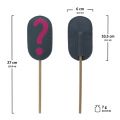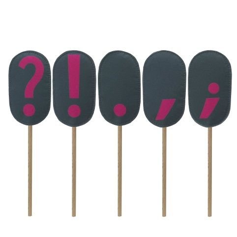 Potištěné plstěné oválky na dřevěné tyčce, s interpunkčními znaménky: Otazník, Vykřičník, Tečka, Čárka, Středník. Výuková pomůcka vyvinutá ve spolupráci s klinickou logopedkou. Vyrobeno ručně v ČR.